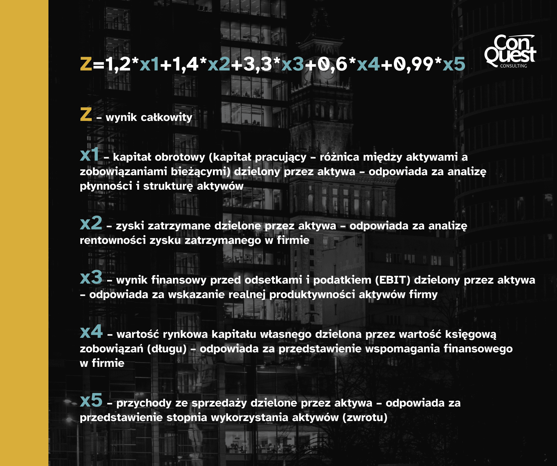 Do pięciu elementów w wyniku wielowymiarowej analizy przypisano odpowiednie współczynniki. Ważone wartości wskaźników oznaczają siłę zmiany każdego parametru, a co za tym idzie wpływ konkretnej sfery finansów przedsiębiorstwa na ostateczną ocenę pod kątem ryzyka bankructwa. Zsumowane wartości ważone oddają obraz kondycji finansowej firmy. Najczęściej wskaźnik Altmana oblicza się z wykorzystaniem następującej formuły: